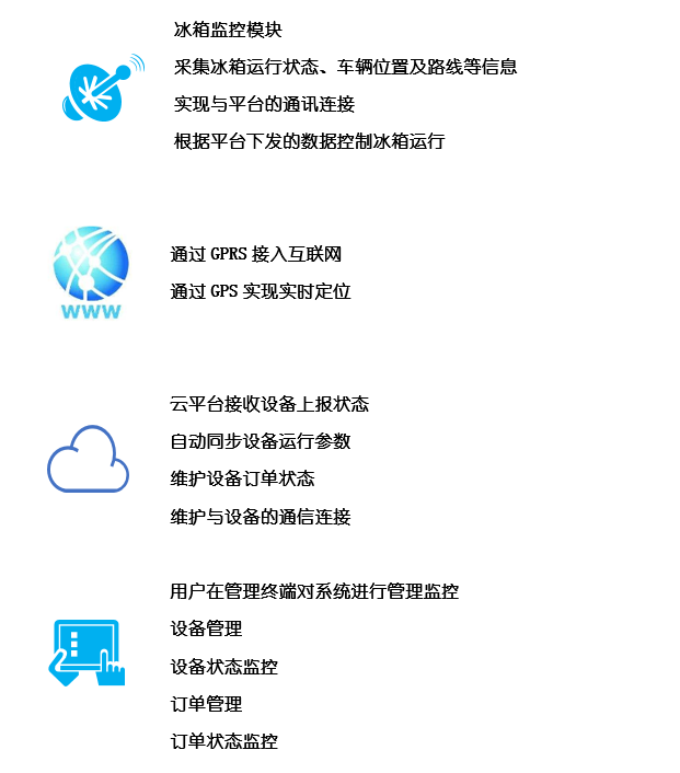 設備周期上報溫度、濕度、電量,以及各種工作狀態(tài)的數據,IOT核心板接收以后進行數據分析,并上報數據和當前GPS信息,用戶可以隨時查看,若發(fā)現冰箱狀態(tài)異常系統將即時上報。